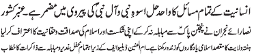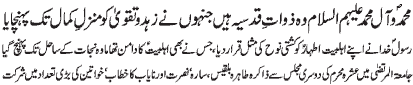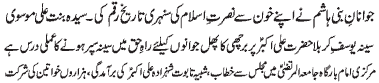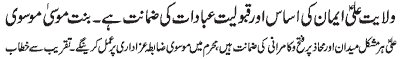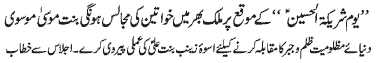 ISLAMABAD, November 10: Solution of all the problems of humanity is hidden in following of the teachings of the Holy Prophet and his Holy Progeny (PBUT) – Umber Kishwar; by declining to do Mobahila with Panjtan Pak (PBUT), the Christians of Nirjaan accepted their defeat and the truthfulness of Islam; the basic purpose of observing Hafta e Walayat is to remember the Islamic history - addresses of Zakiraat to the assemblies of Hafta e Walayat arranged by UWF
