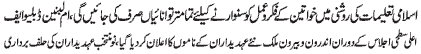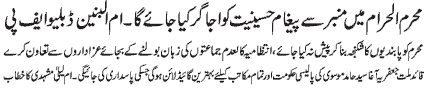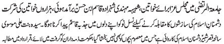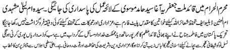 ISLAMABAD, November 3: During Muharram ul Harram the guidelines given by the Quaid e Millat e Jafariya Agha Syed Hamid Ali Shah Moosavi will be followed strictly - Syeda Umme Laila Mash’hadi; UWF is a sacred platform of women for the protection of the signs attributed to Allah. For safeguarding Azadari no stone will be left unturned; Fatima Jinnah supported her brother the Quaid e Azam whole heartedly in the Pakistan Movement; the beloved homeland is in the grip of problems, everyone of us will have to fulfill our responsibilities; to protect our youth from the evil culture we will have to promote Islamic culture and values; Azadari is the protection of Din O Sharia and divine spiritual power
