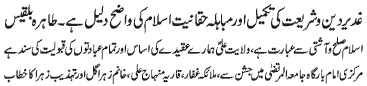 ISLAMABAD, November 9: Ghadeer is the stamp of completion of the religion (Islam) while Mubahila is the proof of Islam’s righteousness; Islam is the religion of peace and harmony; Walayat e Ali is the essence of our ideology and guarantee of the acceptance of our prayers - Addresses of Malaika Ghaffar, Qariya Minhaj Ali, Khanum Zahra Gul, and Tehzeeb Zahra to a Jashan e Ghadeer program held at Markazi Imam Bargah Jamia tul Murtaza
