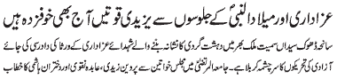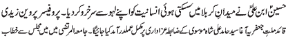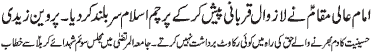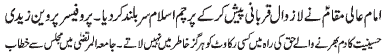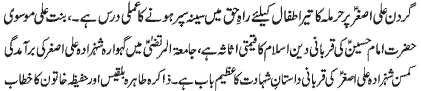 ISLAMABAD, November 21: The great sacrifice of young Ali Asghar (PBUH) is a great chapter of the history of martyrdom - Binte Ali Moosavi; the sacrifice of Hazrat Imam Hussain (PBUH) is a precious asset of Islam. Gehwara of Shehzada Ali Asghar (PBUH) brought out in Imam Bargah Jamia tul Murtaza; by receiving the arrow of Hurmala on his neck, Shehzada Ali Asghar (PBUH) gave children a lesson of courage and determination for the sake of righteousness - Addresses of Zakira Tahira Bilqees and Hafeeza Khatoon